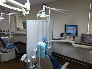 治療の緊張感を和らげるため環境放送を流しています。また、待合室にも同様に大画面で音楽とともに環境放送を流しています。